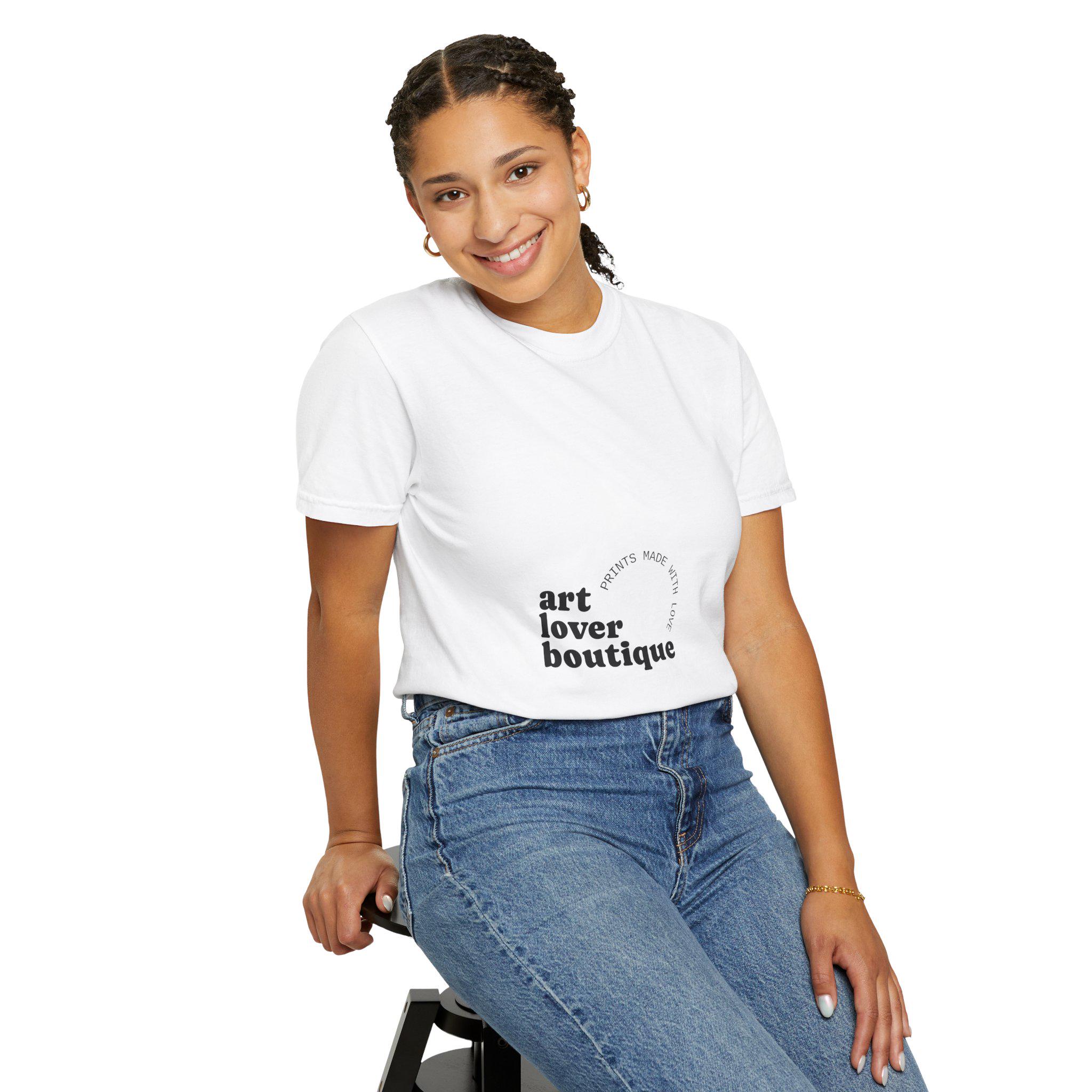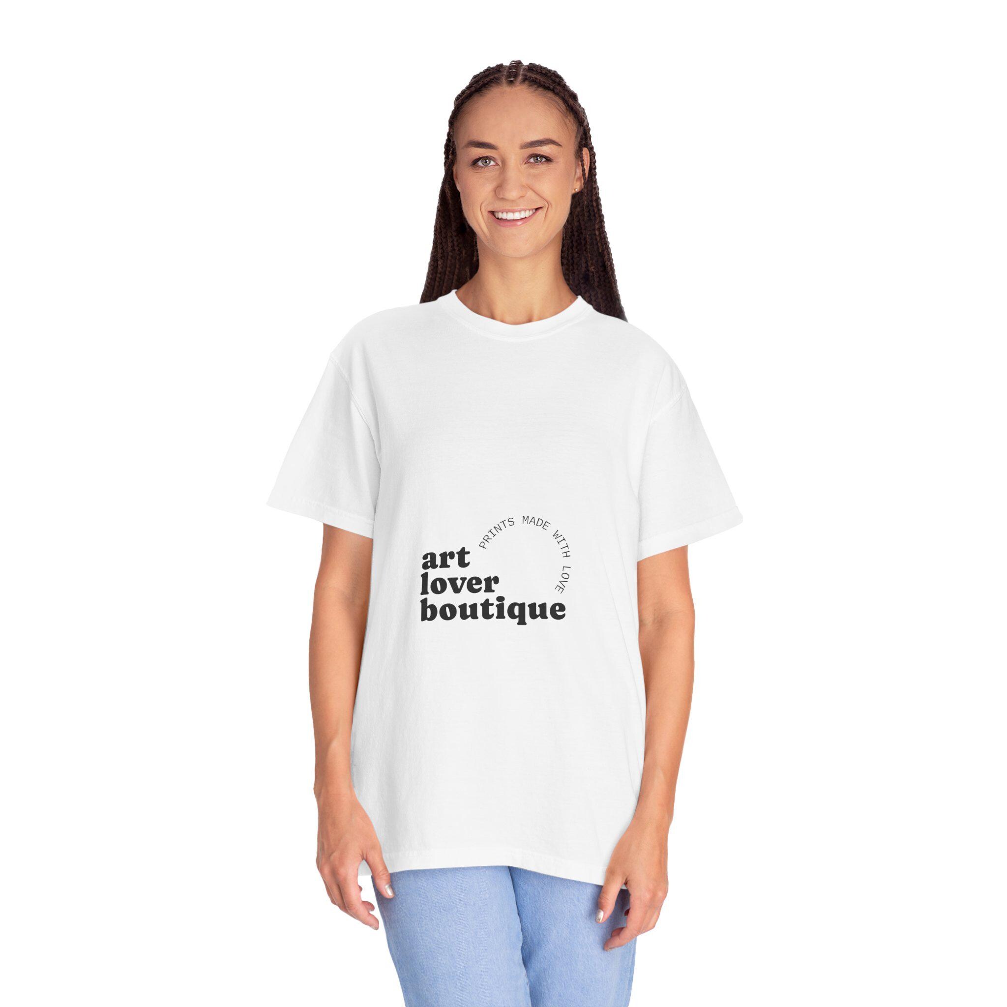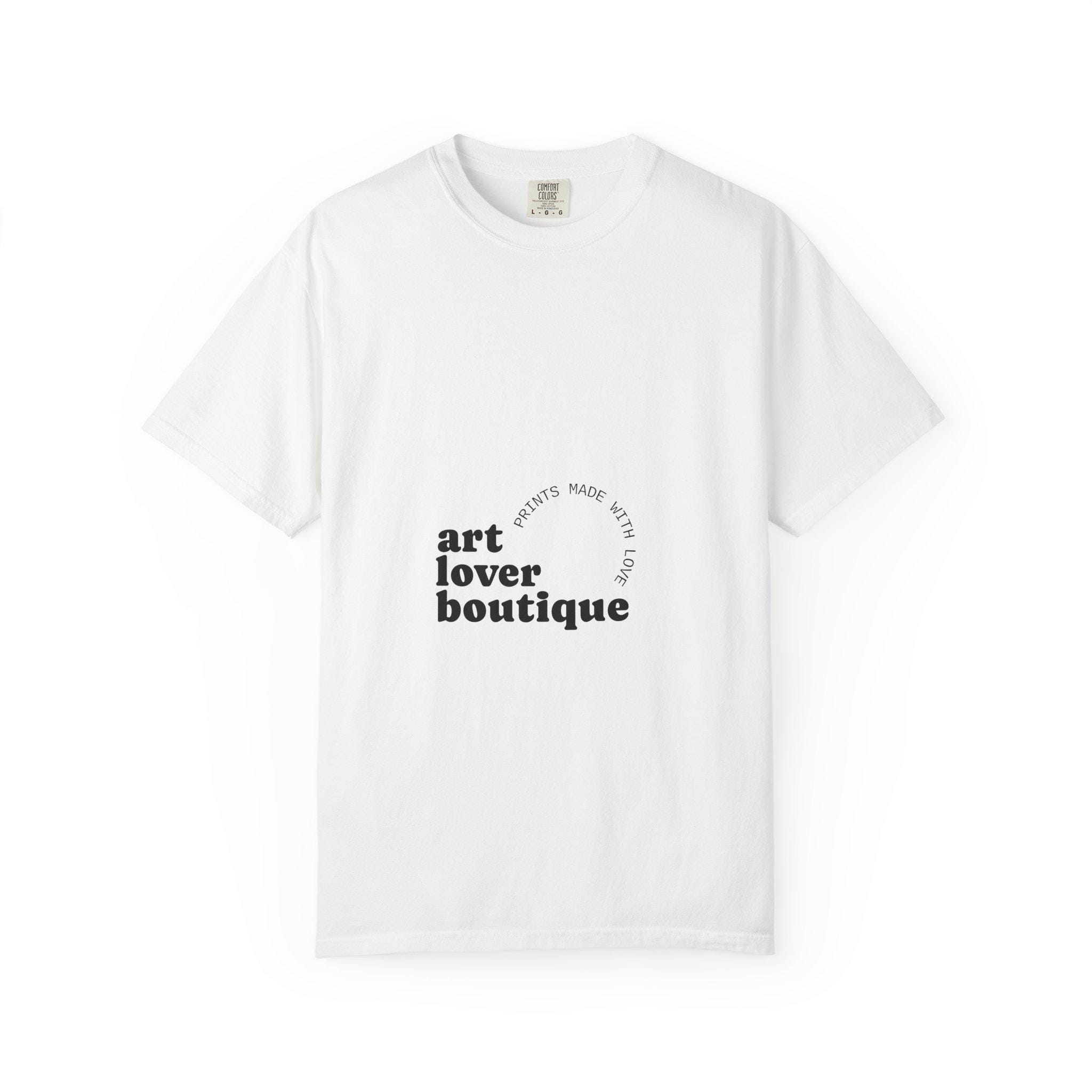 Lightweight, lived-in comfort meets quiet, gallery-ready style. This garment-dyed cotton tee wears like an old favorite from the first wear: the fabric is soft, slightly broken-in, and holds its relaxed shape. The minimal “art lover boutique” print reads like a gentle statement—understated and deliberate—so you can slip it on for museum afternoons, coffee-shop sketching sessions, or a slow weekend of creative work. The relaxed fit and heavyweight knit give the tee a substantial, comfortable feel without stiffness. Available in a wide range of muted, vintage-leaning colors, it layers easily under jackets or stands alone as a simple canvas for your day.