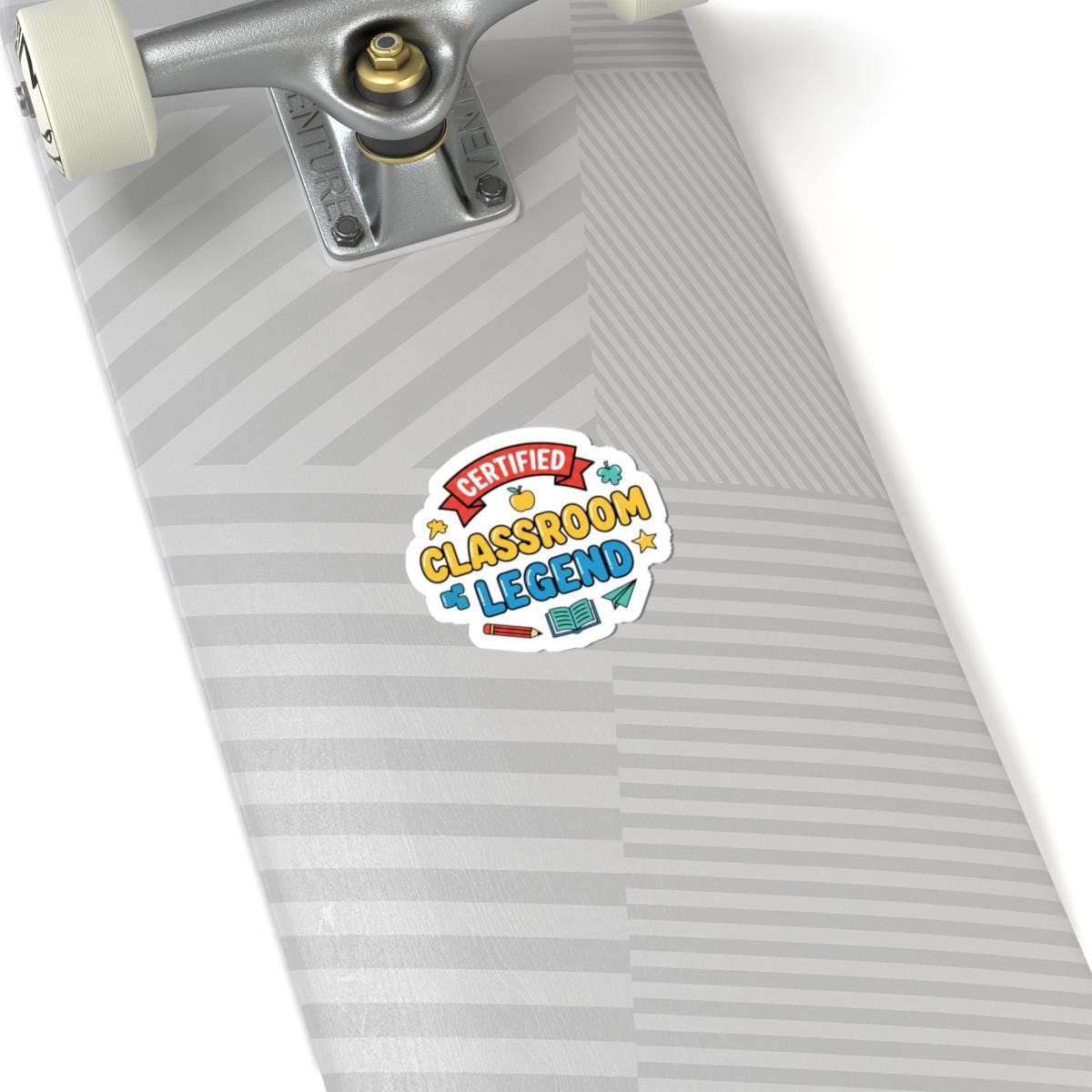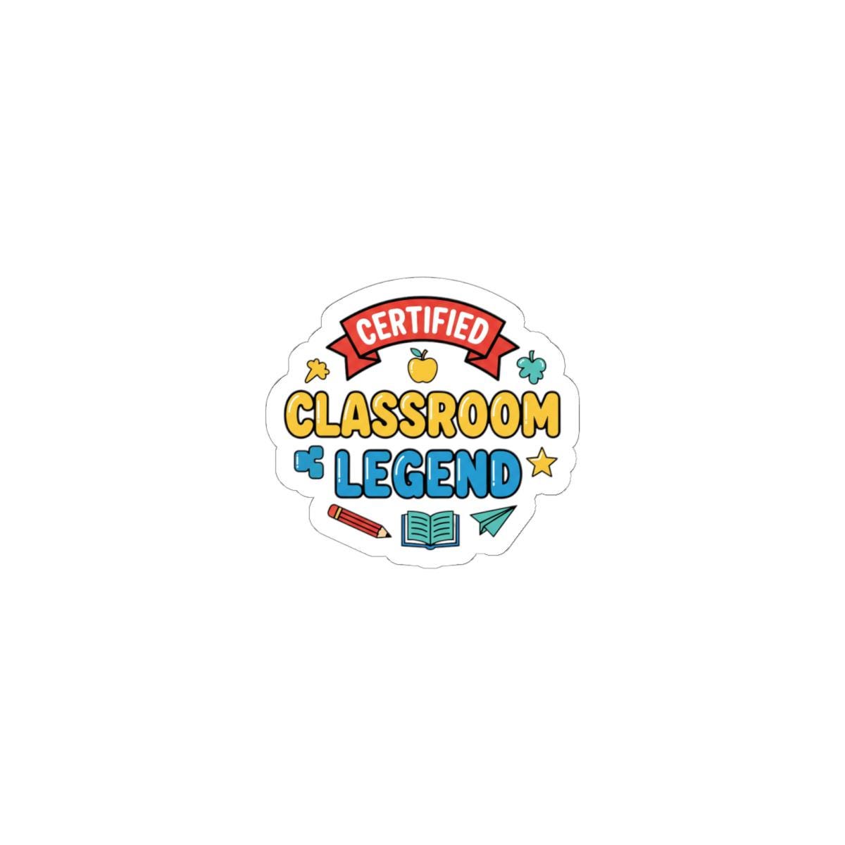 Playful, school-themed sticker celebrating classroom pride with bright, readable lettering and cheerful school motifs. The kiss-cut vinyl design reads at a glance—’Classroom Legend’ framed by a small ribbon, apple, stars, and stationery icons—matching the upbeat, slightly cheeky tone popular for teacher appreciation gifts. It works as a token of thanks used on laptops, journals, water bottles, or classroom supplies during Teacher Appreciation Week or end-of-year celebrations.