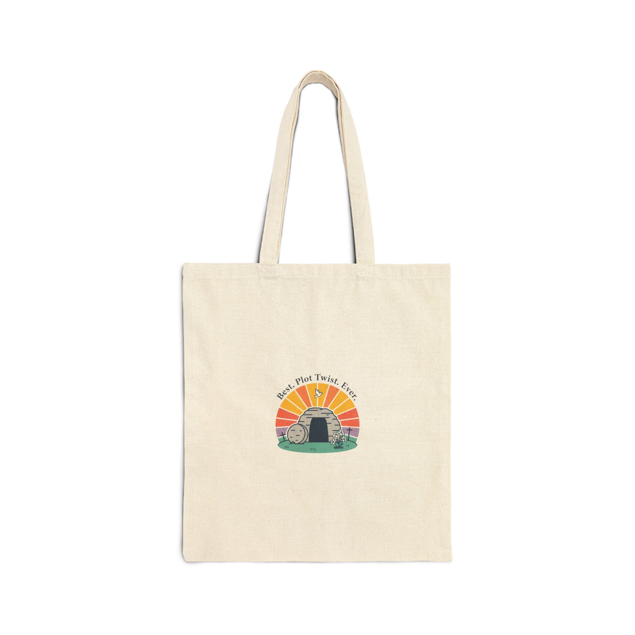 Sunrise resurrection illustration in a soft vintage palette — a gentle, faith-forward Easter tote blending hopeful symbolism with lighthearted warmth. The artwork centers on an open tomb set against a sunrise burst with muted oranges and pastels, paired with small, cheerful accents that read as reverent but playful. The natural cotton canvas and simple flat construction give it a calm, timeless look that fits into Easter Sunday outfits and church-group outings without feeling flashy.