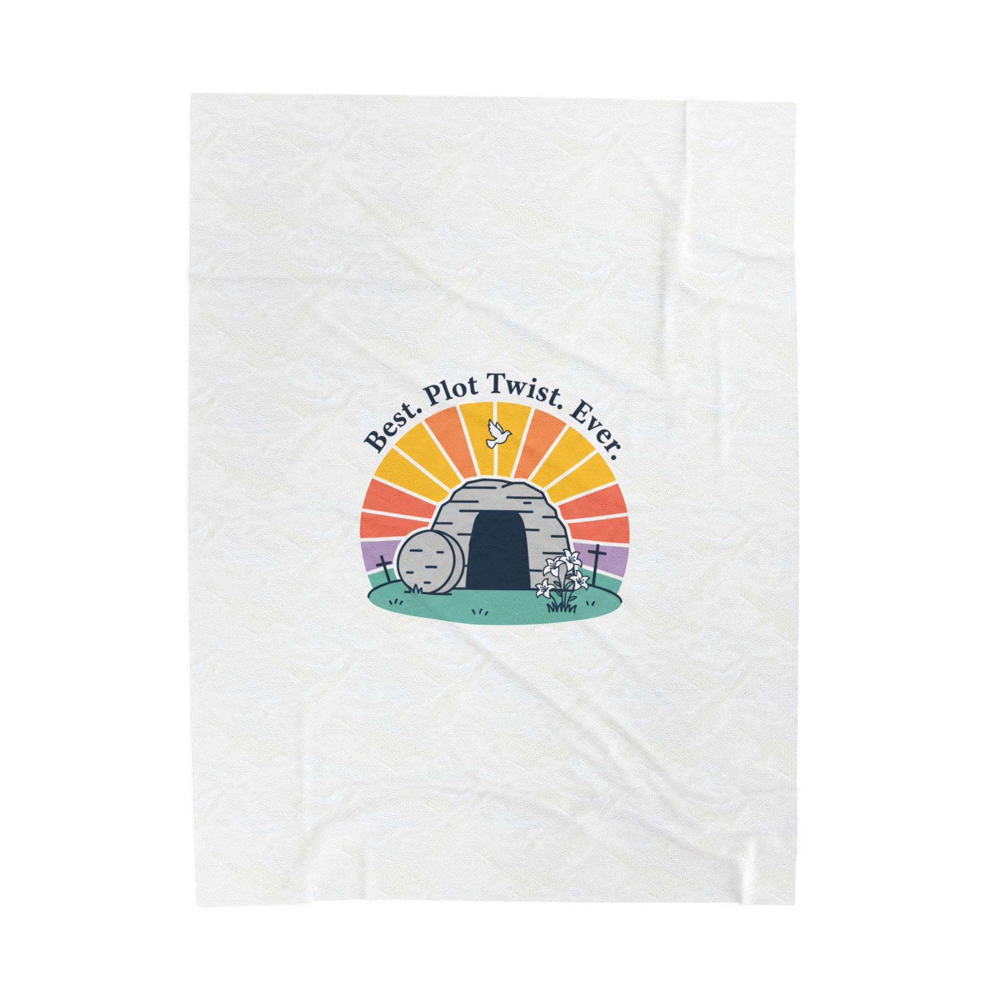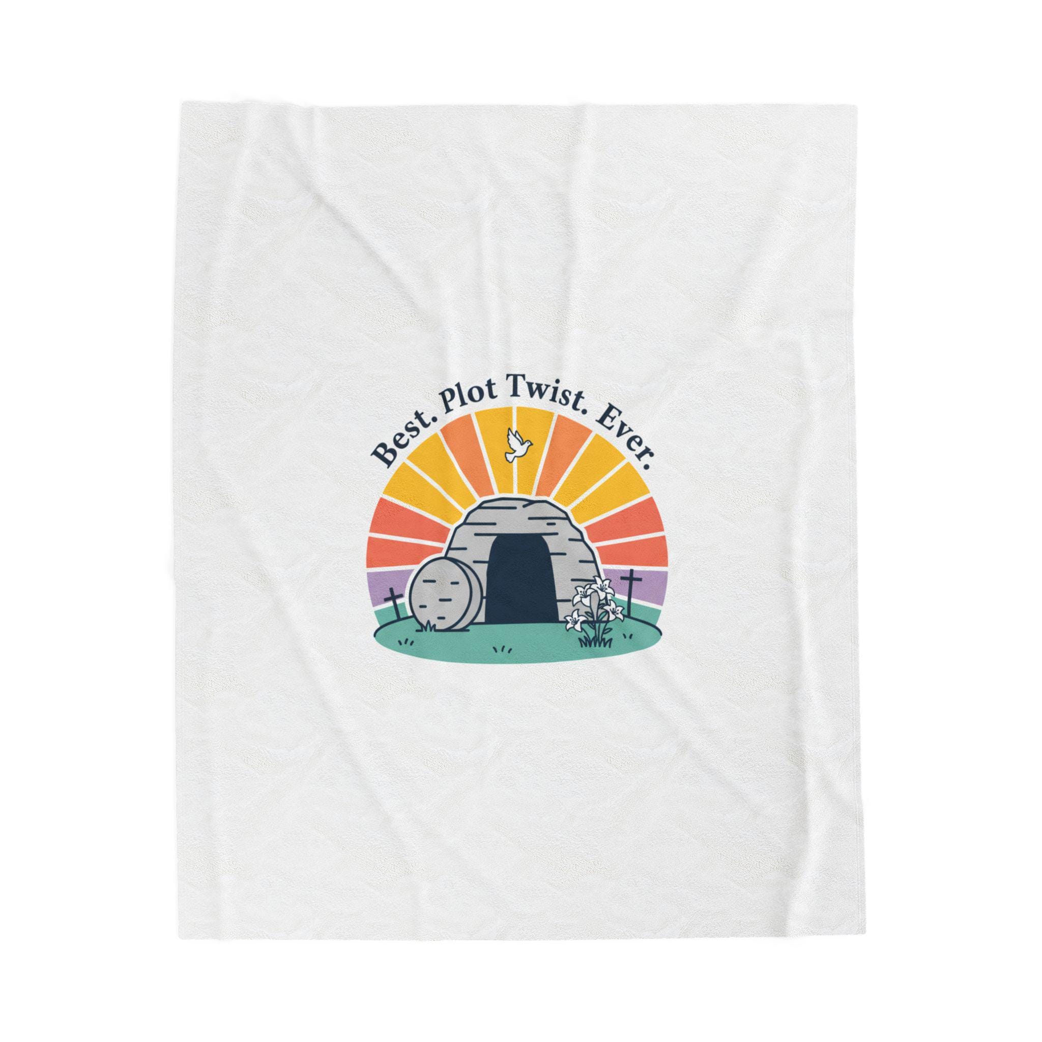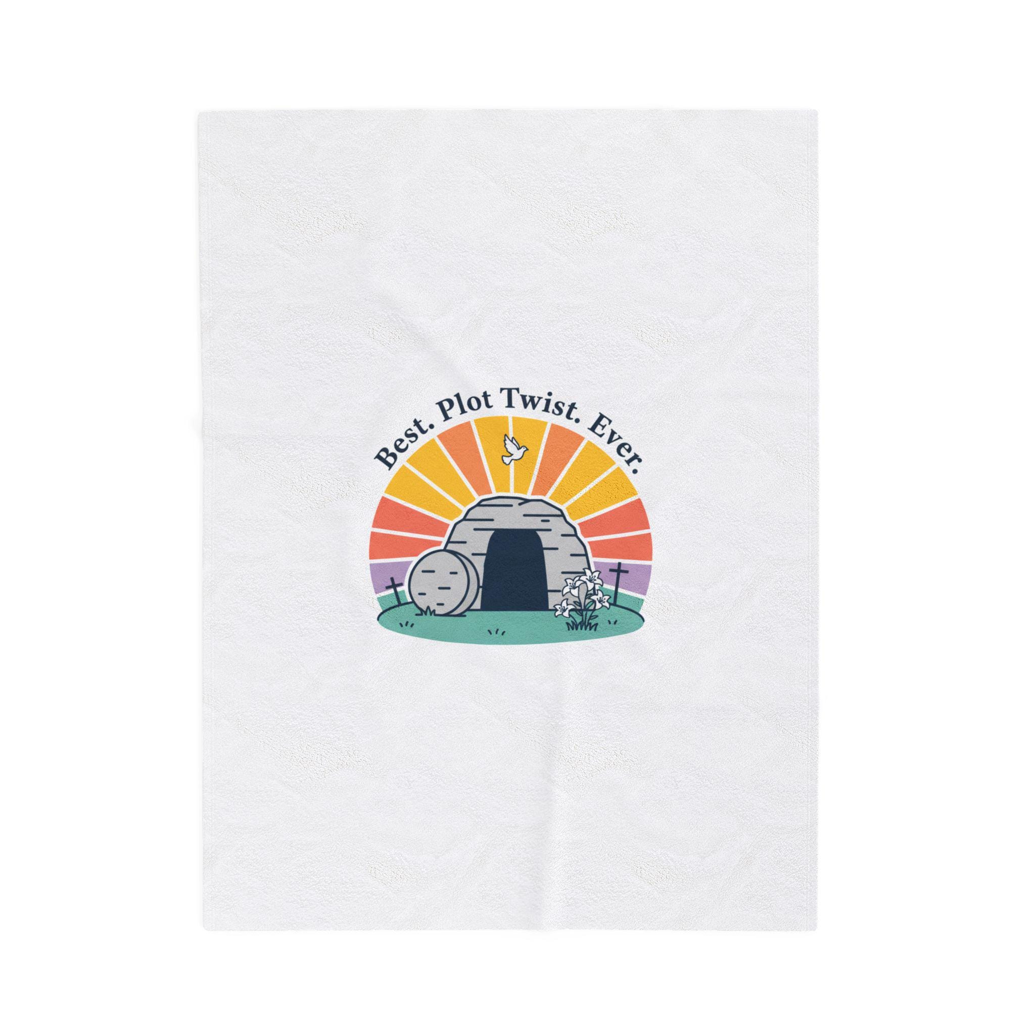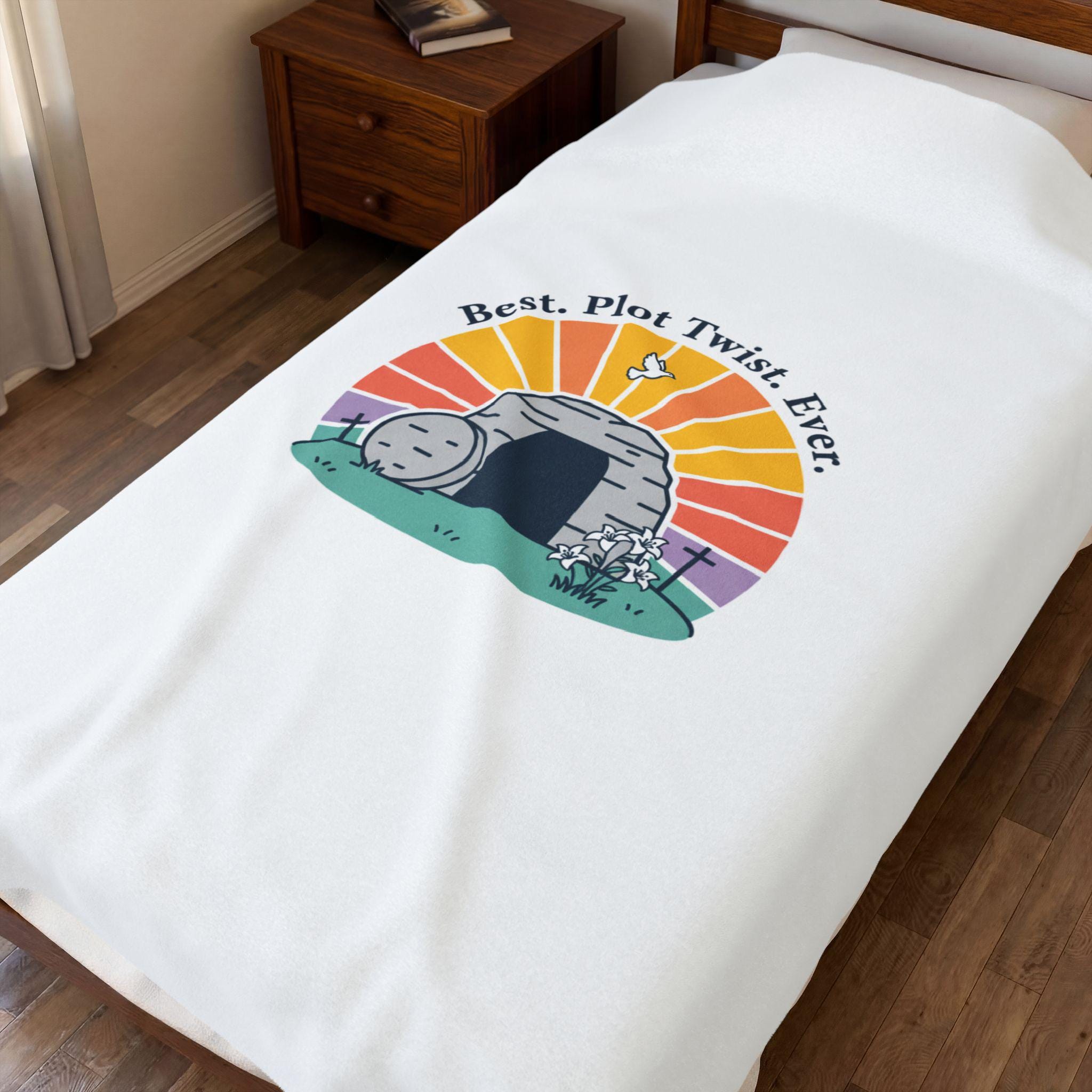 Soft, playful Easter blanket featuring a gentle resurrection-themed illustration: a round stone rolled away from a tomb with a sunrise behind it and the lighthearted line “Best. Plot Twist. Ever.” rendered in simple vintage-inspired type. The soft palette and clean lines blend reverent symbolism with warm humor that fits family-focused church gatherings or quiet mornings of reflection. Lightweight yet medium-heavy polyester offers a cozy layer for seasonal services, car rides to church, or lounging at home while celebrating the holiday.