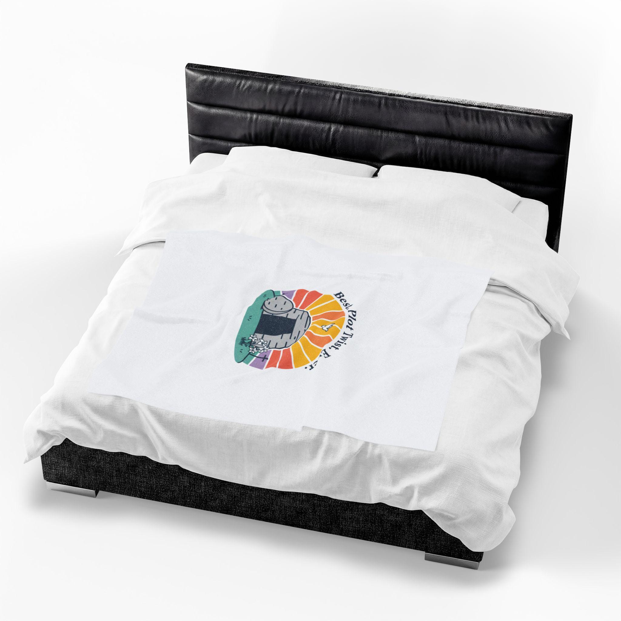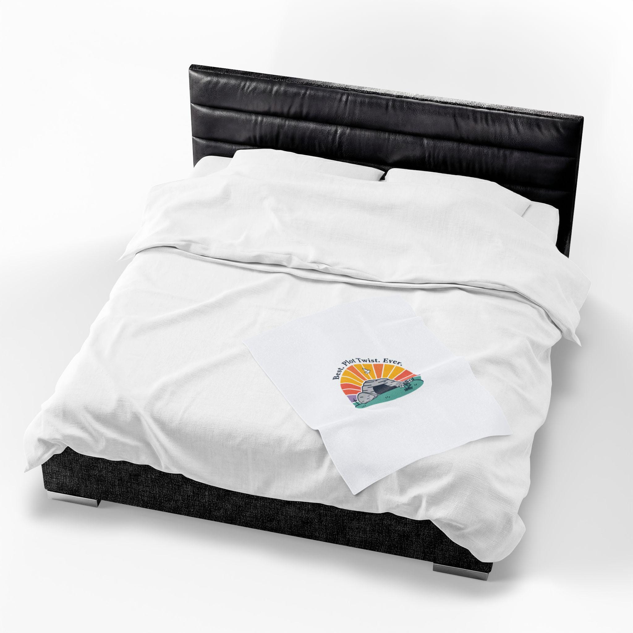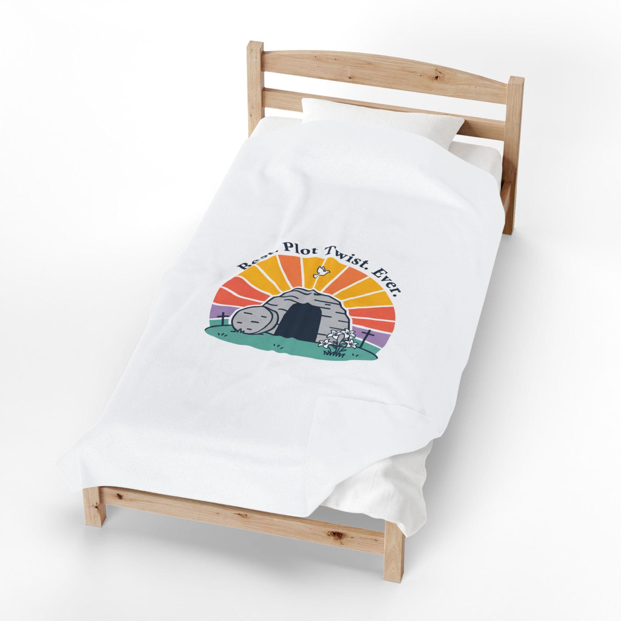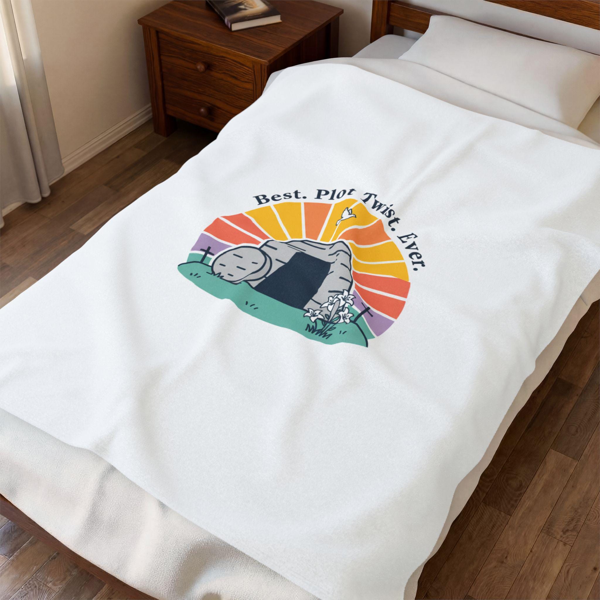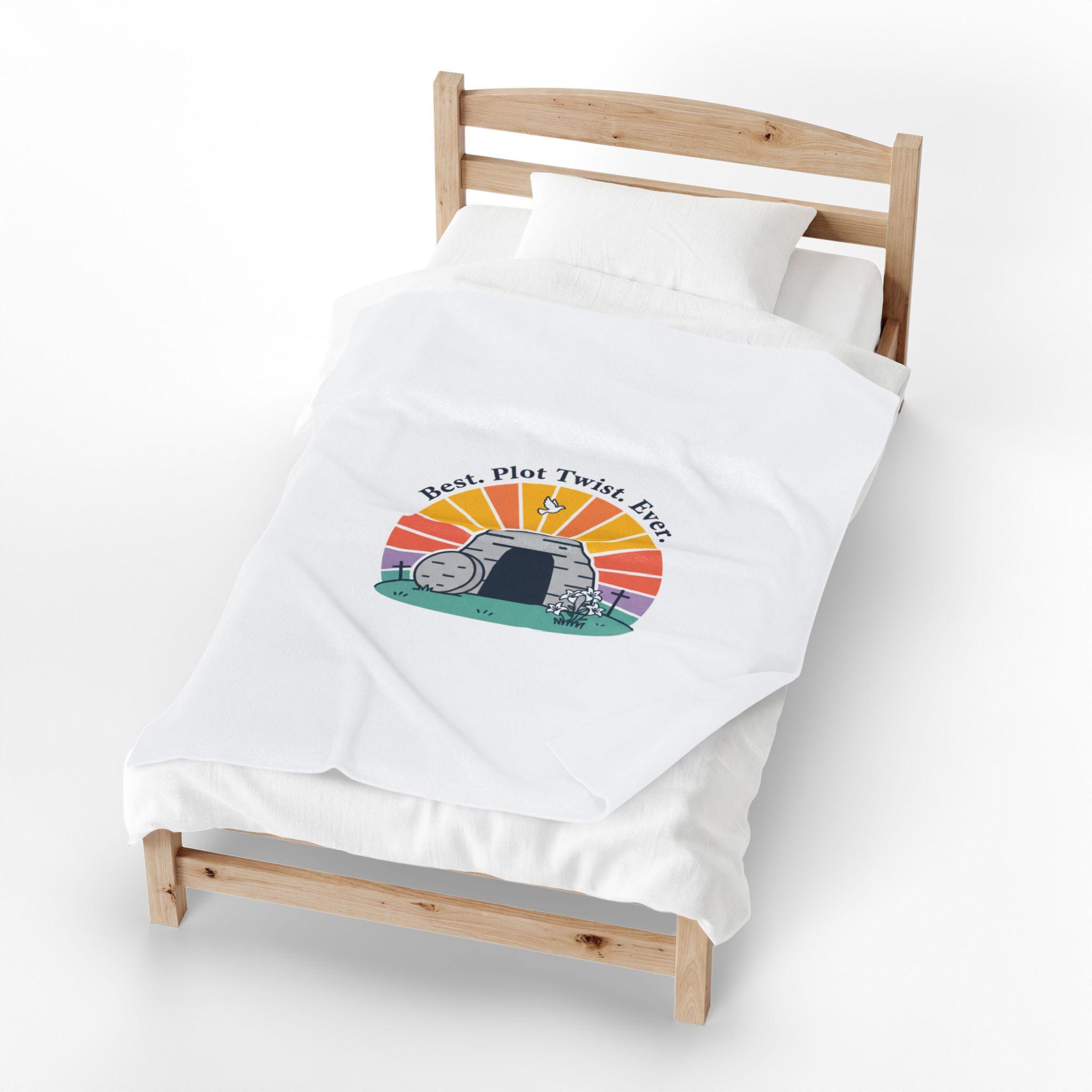 Soft, playful Easter blanket featuring a gentle resurrection-themed illustration: a round stone rolled away from a tomb with a sunrise behind it and the lighthearted line “Best. Plot Twist. Ever.” rendered in simple vintage-inspired type. The soft palette and clean lines blend reverent symbolism with warm humor that fits family-focused church gatherings or quiet mornings of reflection. Lightweight yet medium-heavy polyester offers a cozy layer for seasonal services, car rides to church, or lounging at home while celebrating the holiday.