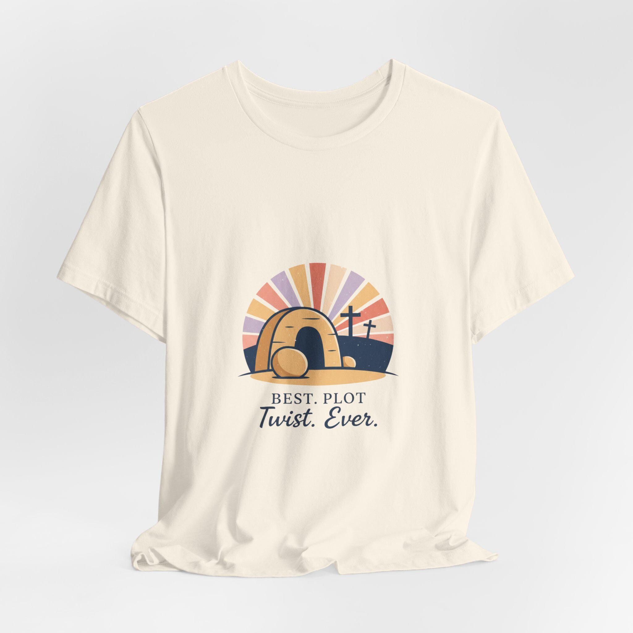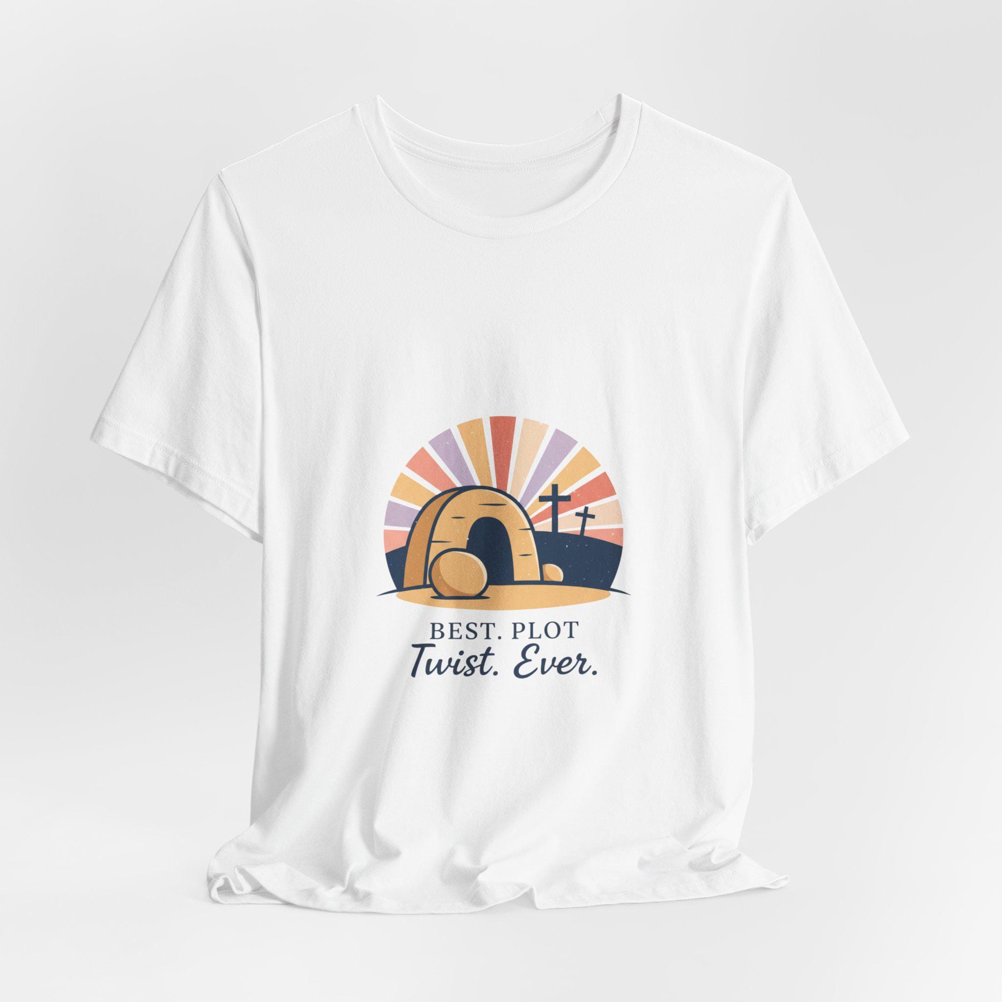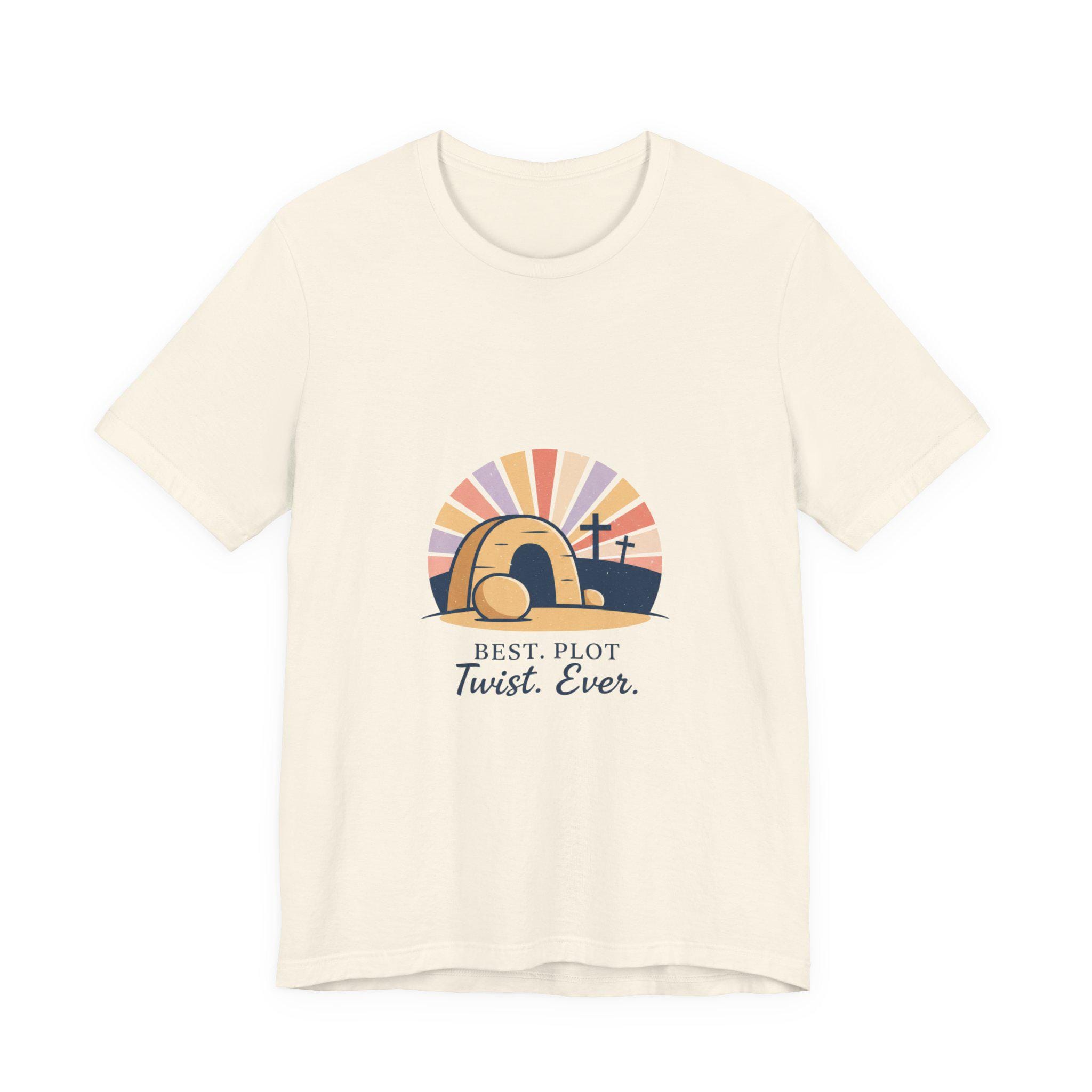 A soft-palette Christian Easter tee that mixes reverent imagery with gentle humor: a minimalist empty-tomb illustration with sunrise rays and three crosses, paired with the lighthearted line “Best. Plot Twist. Ever.” The artwork leans vintage-inspired with muted sunrise colors and clean, classic type, fitting the Playful Christian Easter Humor trend by celebrating the resurrection in an approachable, family-friendly way. Wear it to church services, community breakfasts, or casual Easter gatherings to share a hopeful, conversational message.