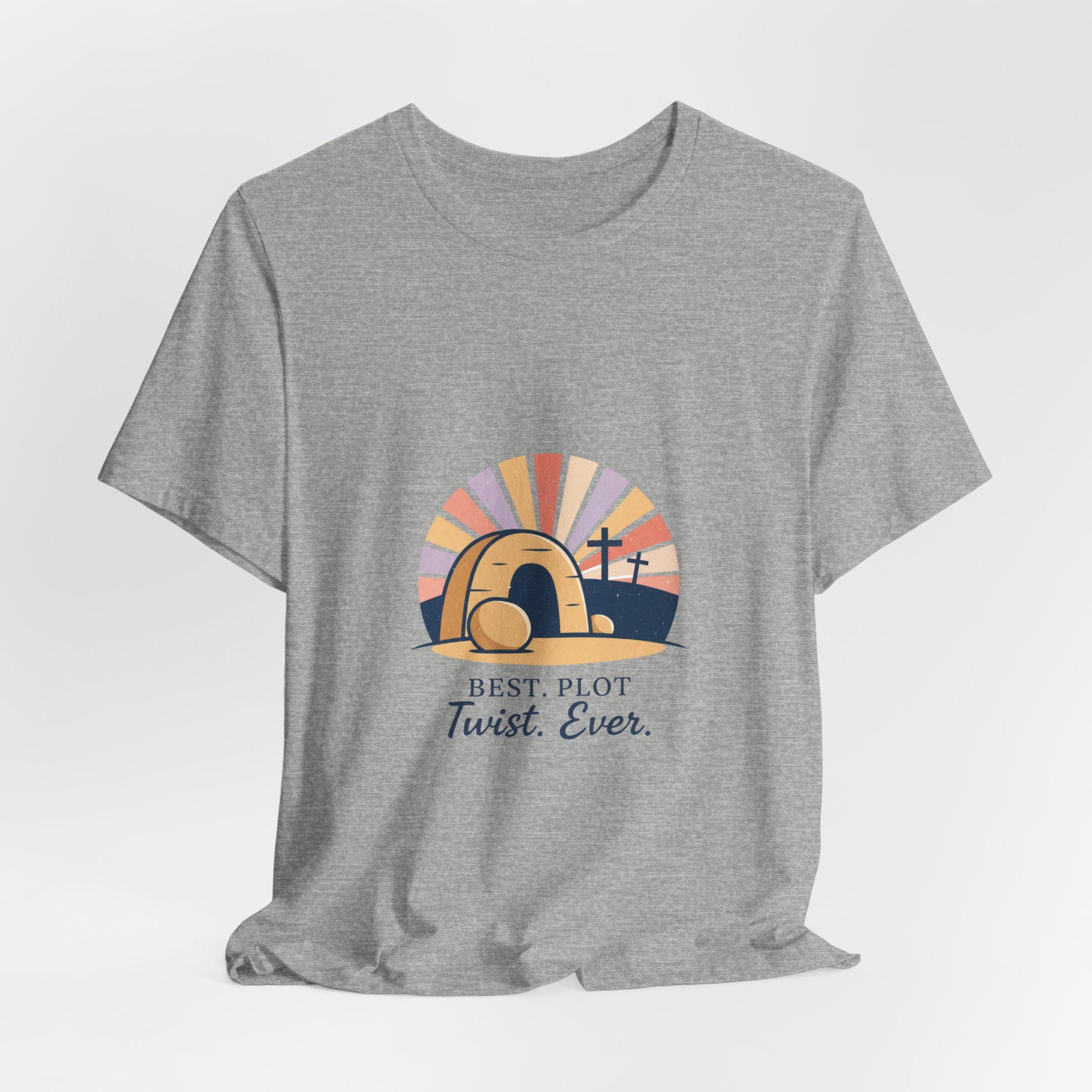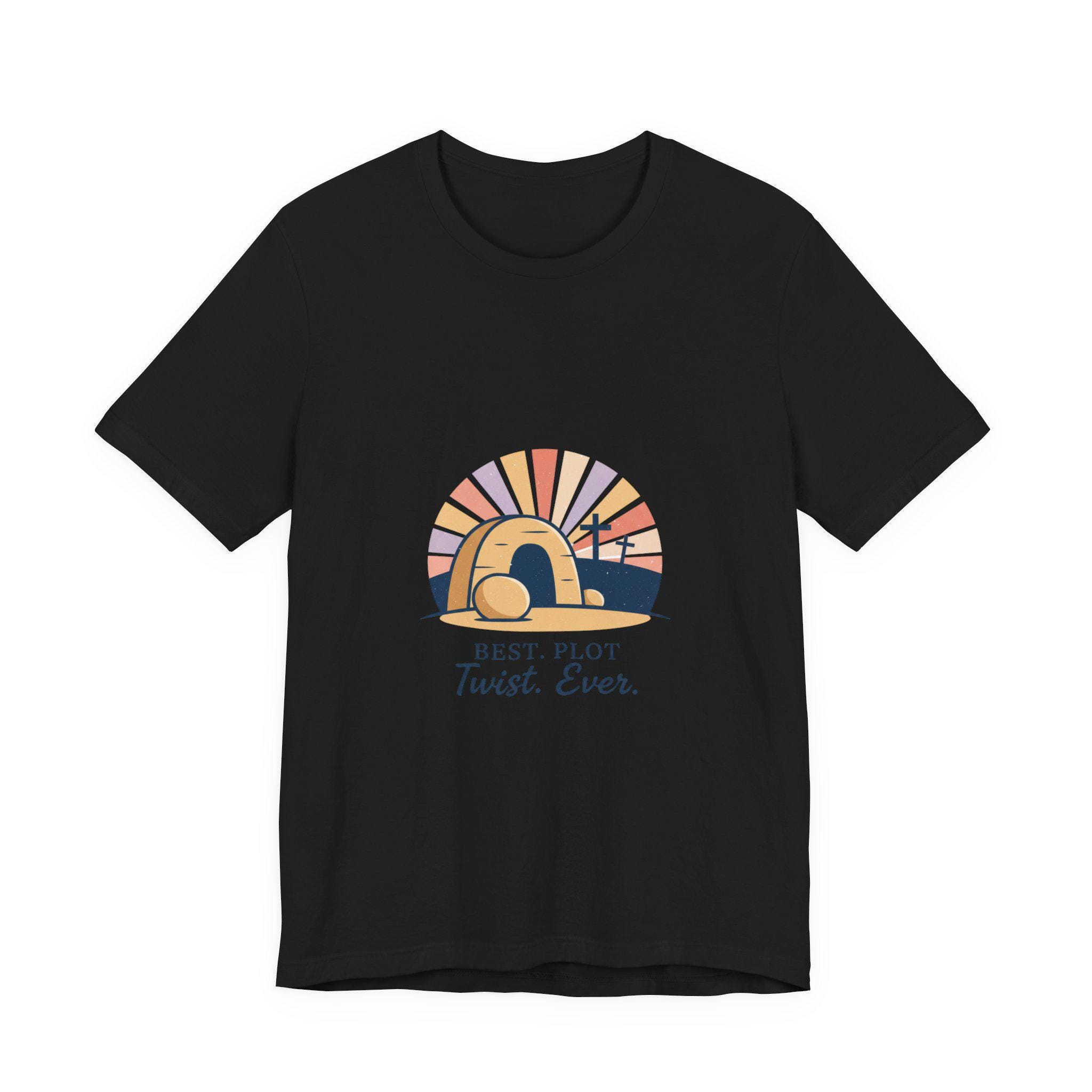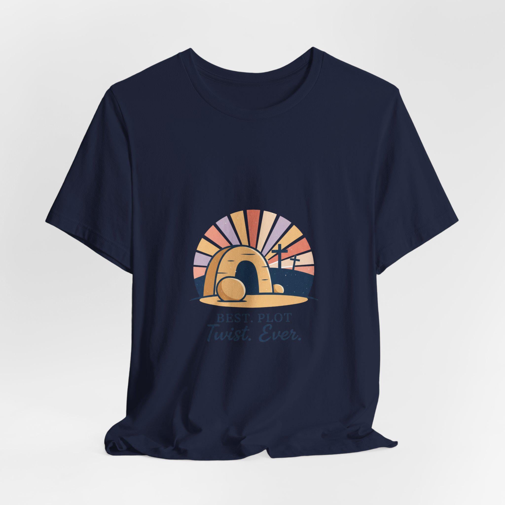 A soft-palette Christian Easter tee that mixes reverent imagery with gentle humor: a minimalist empty-tomb illustration with sunrise rays and three crosses, paired with the lighthearted line “Best. Plot Twist. Ever.” The artwork leans vintage-inspired with muted sunrise colors and clean, classic type, fitting the Playful Christian Easter Humor trend by celebrating the resurrection in an approachable, family-friendly way. Wear it to church services, community breakfasts, or casual Easter gatherings to share a hopeful, conversational message.