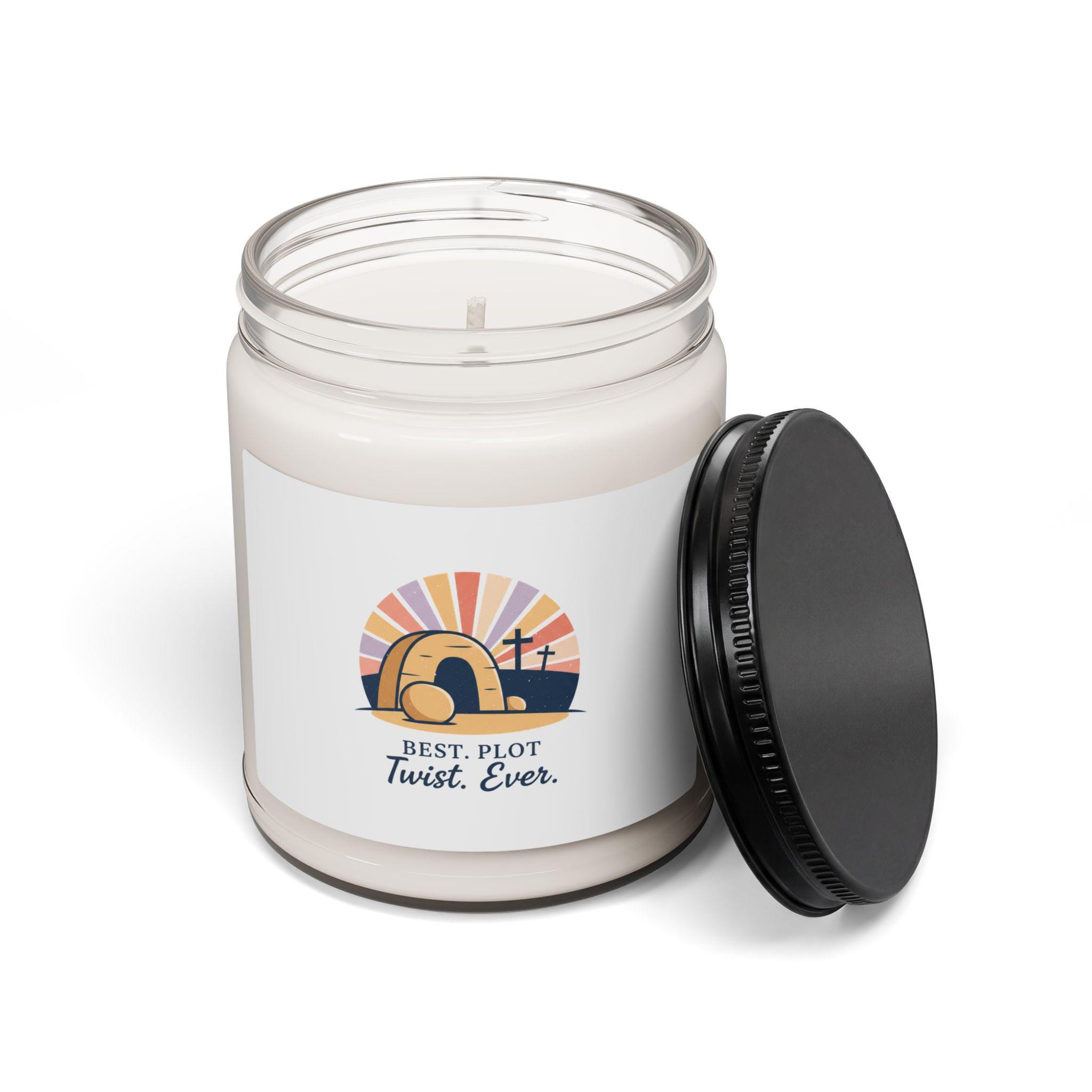 Warm, lightly humorous Easter candle pairing gentle resurrection imagery with a sunrise-inspired palette. The label shows a stylized empty tomb with a rising sun and three hilltop crosses, beneath the playful line “Best. Plot. Twist. Ever.” — balancing respectful faith-based tone with family-friendly humor that fits the Playful Christian Easter Humor trend. Soft vintage type and calm colors make it feel seasonal and serene, suitable for church gatherings, home devotion time, or mellow spring decor.