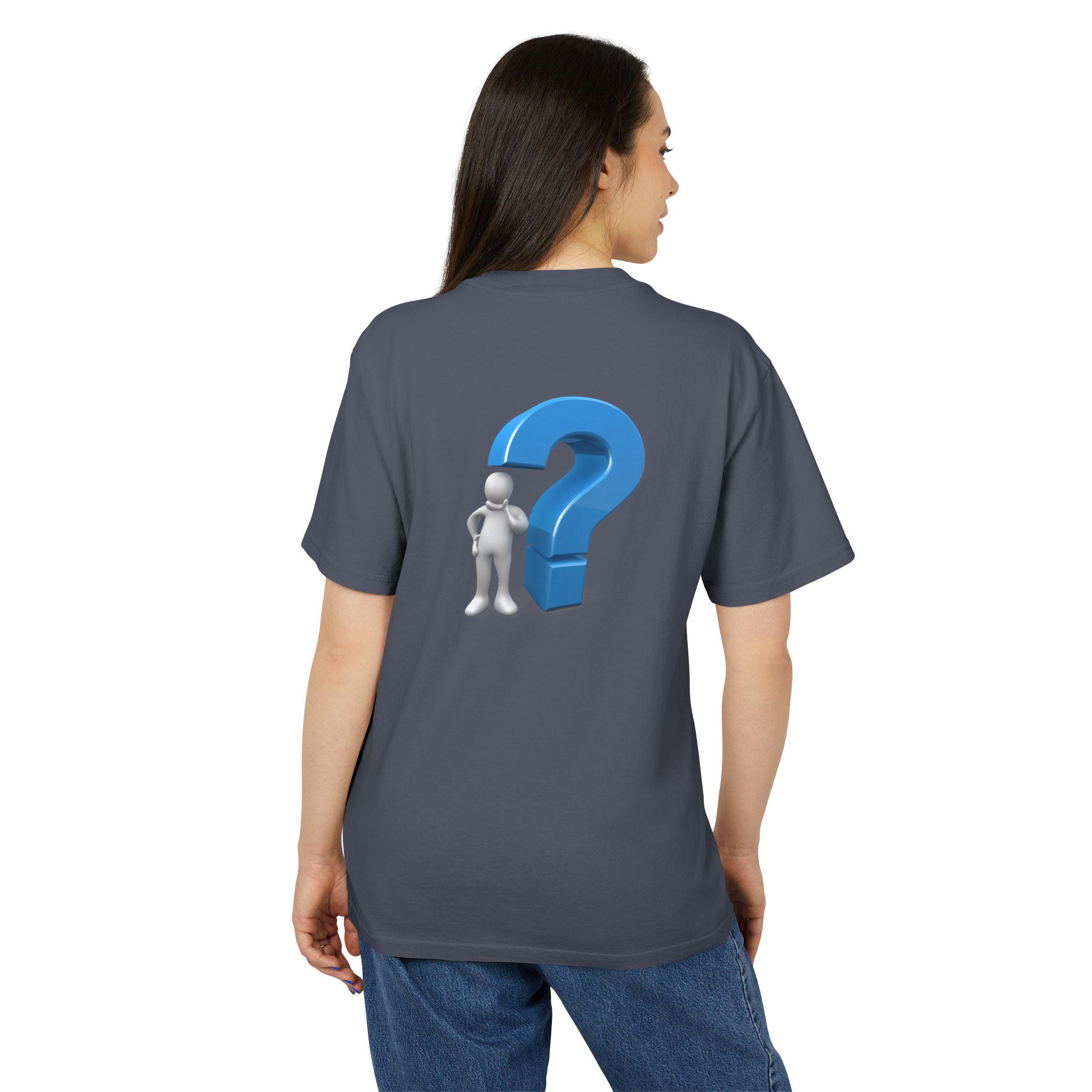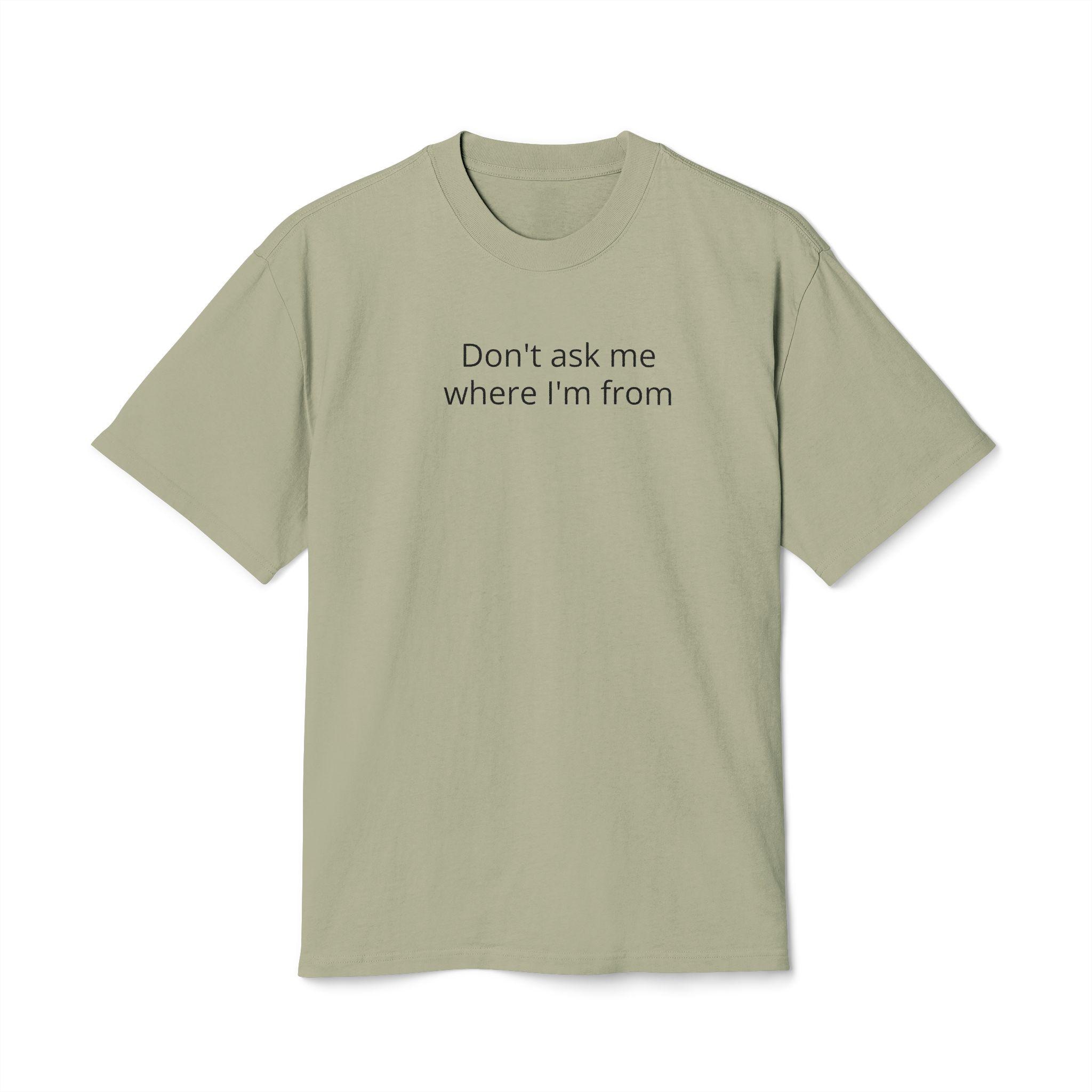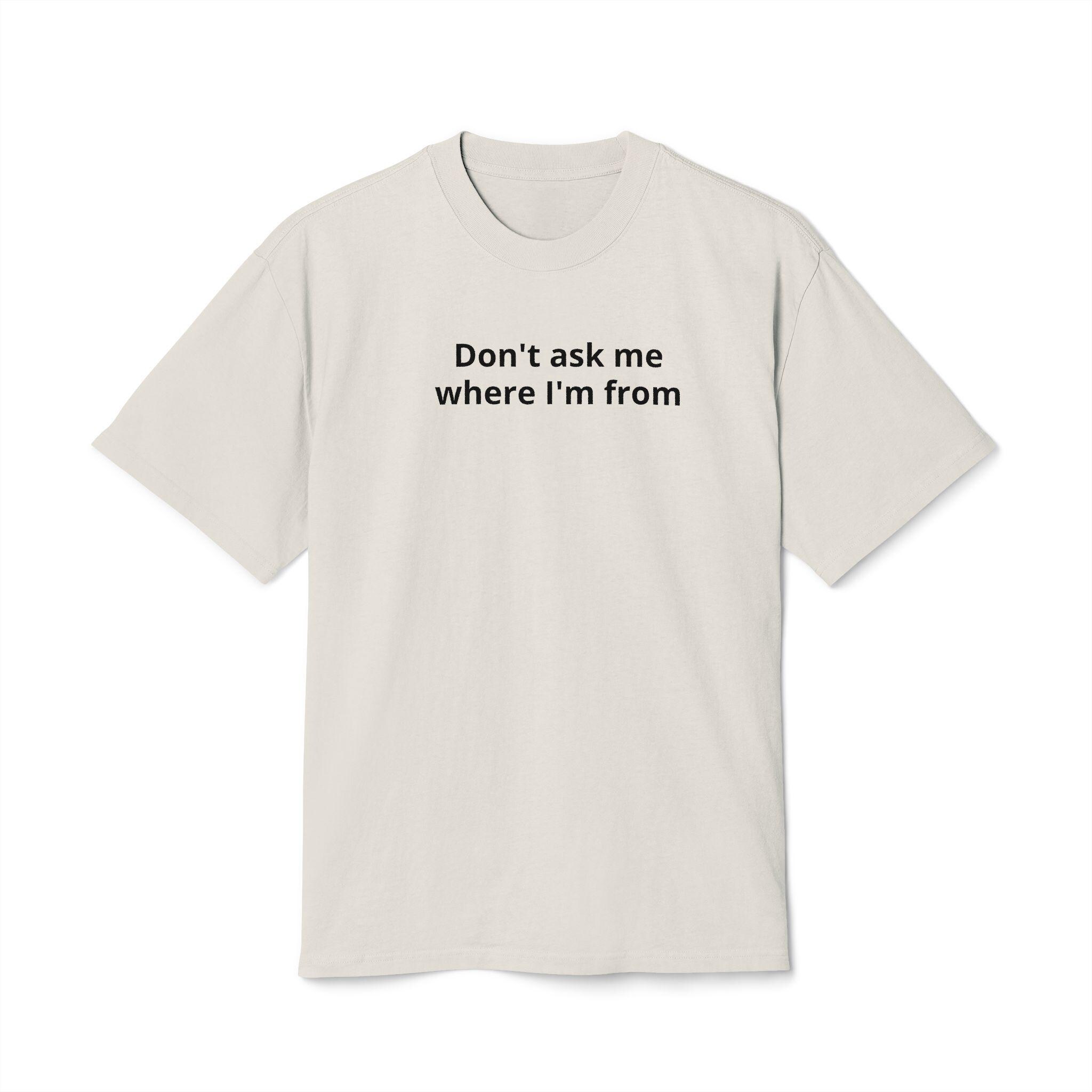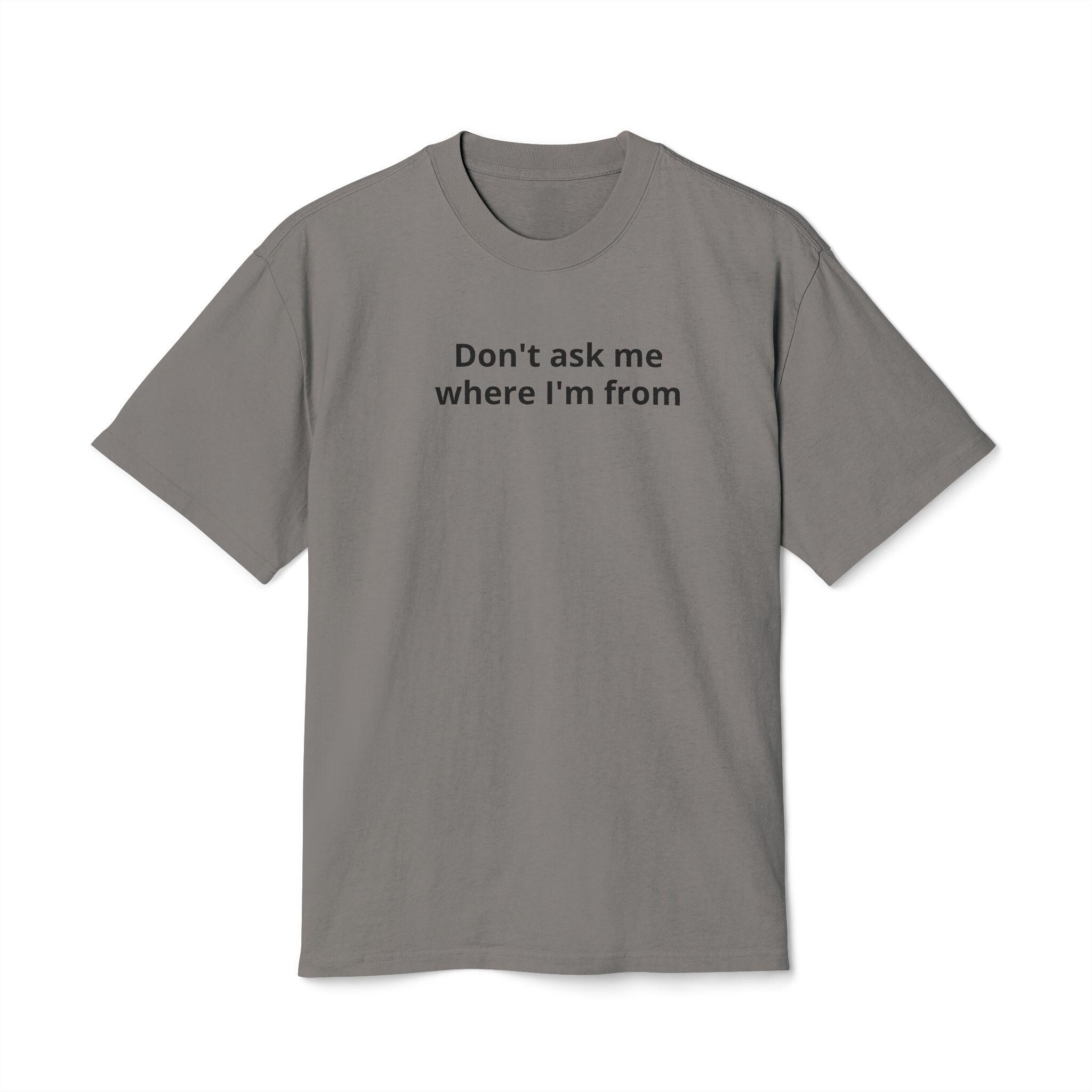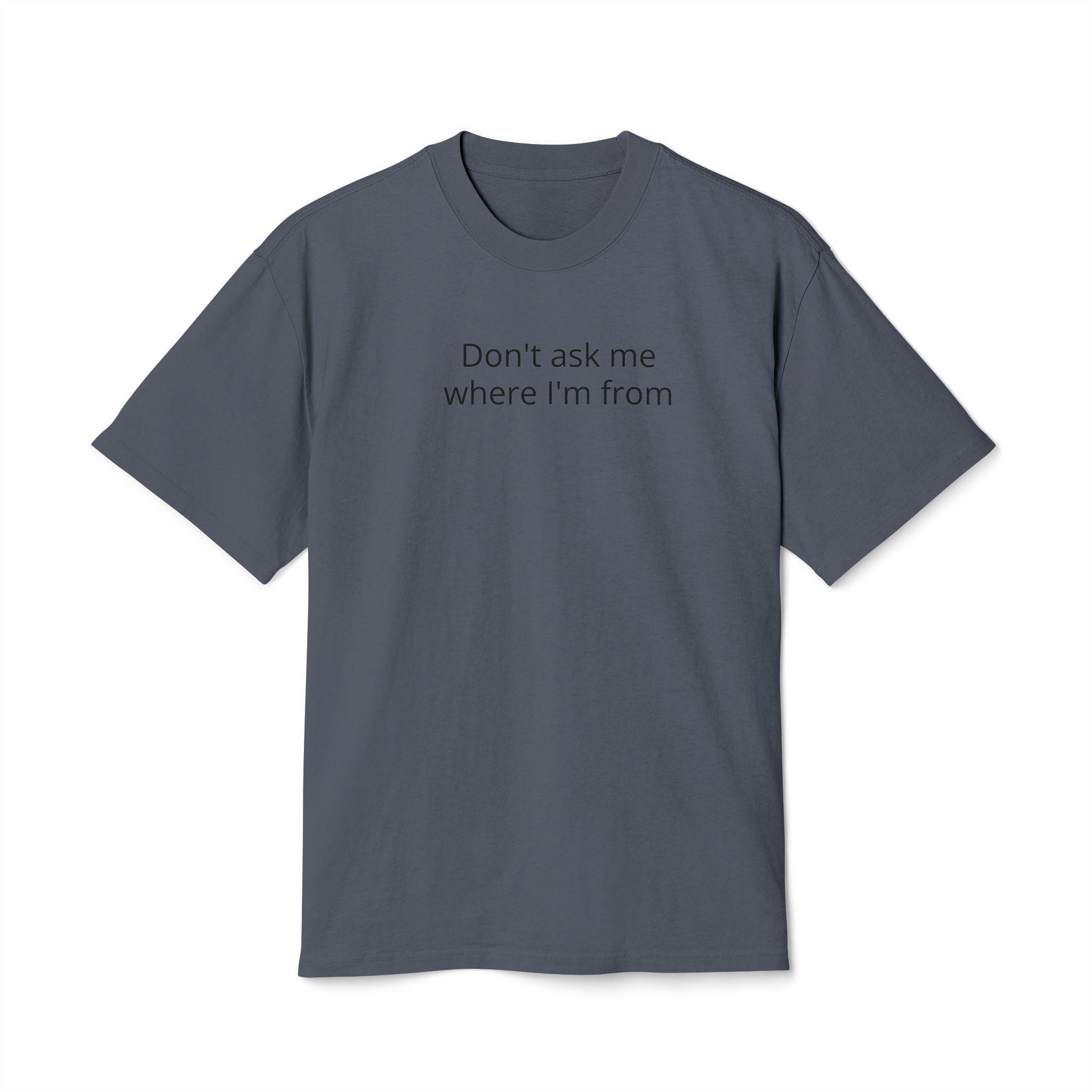 This boxy, heavyweight tee carries a quiet, slightly mischievous attitude. The front’s deadpan line—“Don’t ask me where I’m from”—lands soft and matter-of-fact across the chest, while the back’s oversized question-mark graphic turns curiosity into a visual joke. The faded, post-dye finish and roomy dropped shoulders create a lived-in look that reads casual and deliberate. Wear it when you want your outfit to start conversations without giving answers. It pairs with worn denim, low-key sneakers, and evenings that call for low effort and dry humor.