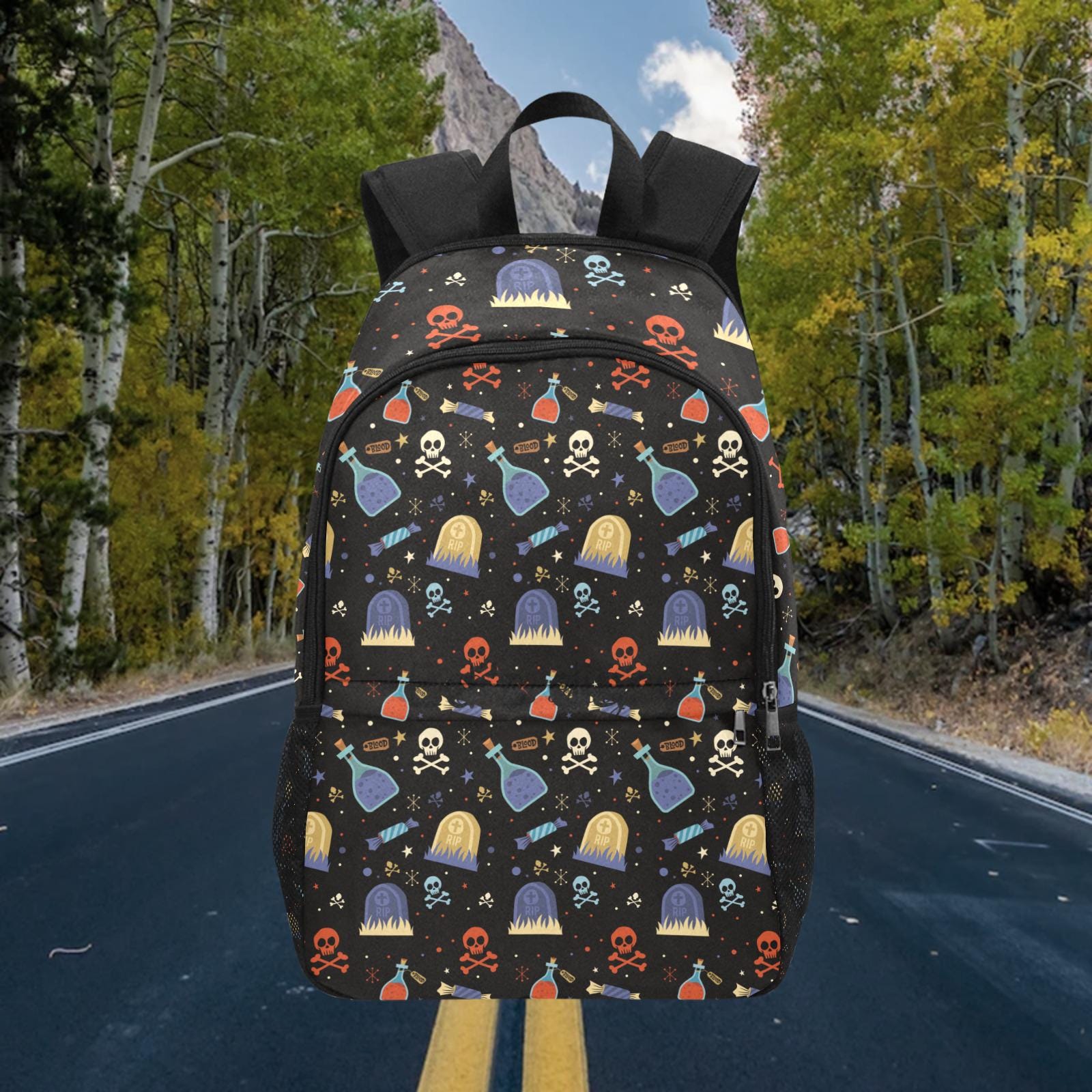 Fabric Backpack with Side Mesh Pockets (1659)【Type】100% Polyester, 11.81"(L) x 5.51"(W) x 17.72"(H) x 5.9"(Hand Drop). All-Over Printing.【Product description】15.87 Oz. Made from 100% polyester, durable and fashionable. Two main pockets for carrying books, binders, clothes and one front pocket is suitable for storing some small things. Padded back and adjustable shoulder straps for ultra comfort and stability. Zipper closure allows it easy to open and close.【Applicable situation】School, hiking, training class, shopping, zoo, park, outdoor sports, for men and women.【Size】11.81"(L) x 5.51"(W) x 17.72"(H) x 5.9"(Hand Drop).【Parts structure】Top handle strap, adjustable shoulder strap. There are mesh pockets on each side of the bag.【Washing notice】Suggest hand washing.【Designer tip】To ensure the highest quality print, please note that this product's recommended uploaded image size in pixels (W x H): 4112 x 2512 px or higher / 150 dpi.